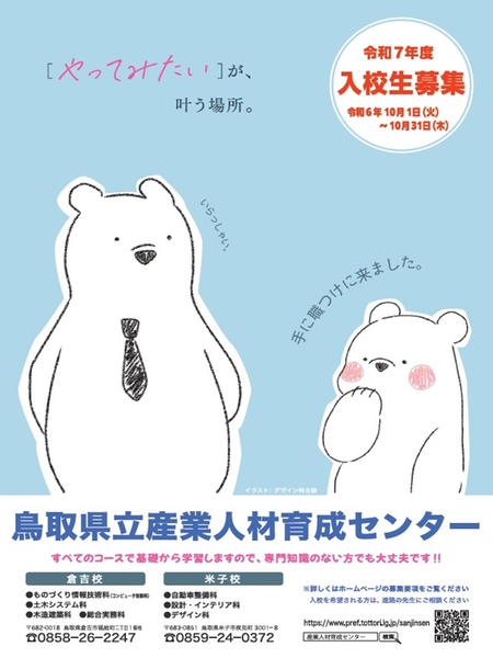 鳥取県立産業人材育成センターは、鳥取県が設置する職業能力開発校であり、高校を卒業して専門知識や技術を学びたい方や、再就職のためにスキルアップを図りたい方など実践的な知識・技能を学び、就職に直接つながる人材を育成しています。