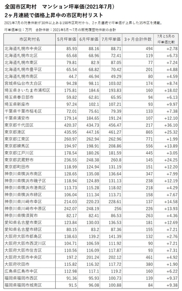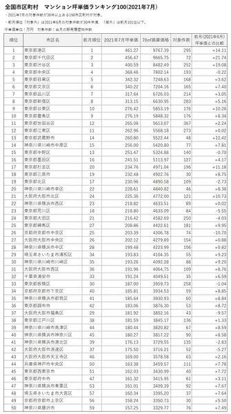 「マンションレビュー」2021年7月 全国市区町村 マンション坪単価 ランキング100を発表