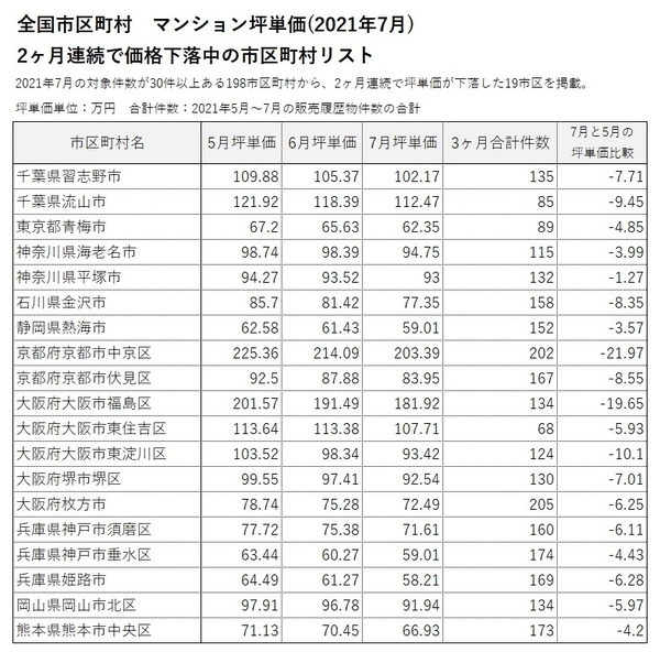 「京都府京都市中京区」「大阪府堺市堺区」「岡山県岡山市北区」「熊本県熊本市中央区」の4市区では、4月から3ヶ月連続で下落。