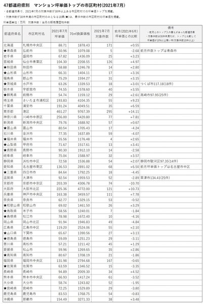 なお、備考欄に「対象件数は30件未満だが各都道府県でのトップより10%以上坪単価が高い市区町村(対象件数10件以上)」や前月とのトップの入れ替えがあった旨などを補足記載。