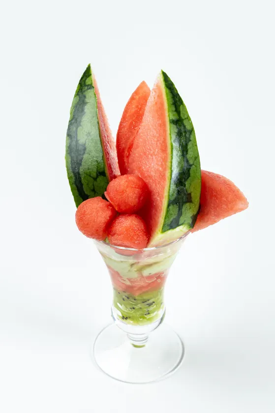 スイカの皮に見立てたキウイゼリーやキウイソルベに加え、隠れているヨーグルトアイスやラズベリーコンフィチュールを一緒に味わうことで今までにない新しい味の変化をお楽しみ頂けます。