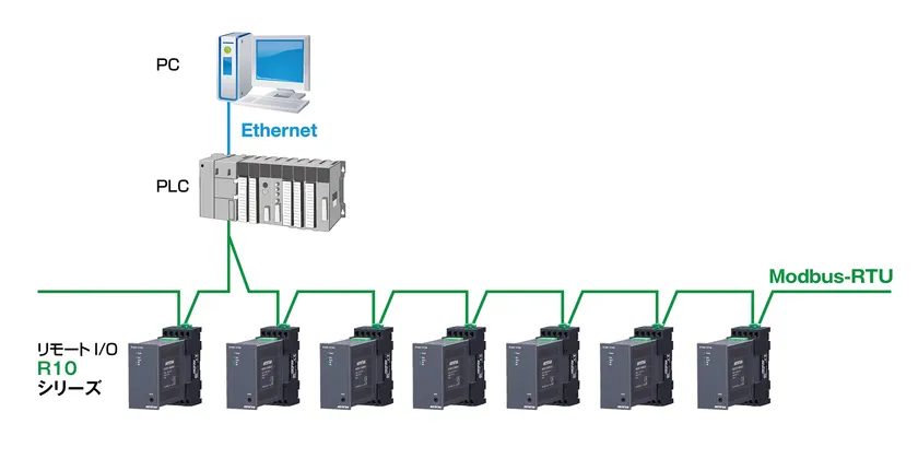 リモートI/O R10シリーズは、本体とベースが分離するプラグイン構造を採用しています。ベースに配線を接続するため、本体の検査・交換の際に配線を外す必要がなく、メンテナンス性に優れています。さらに密着取付ができるため、制御盤取付の省スペース化が行えます。通信ネットワークはModbus-RTUをご用意しました。