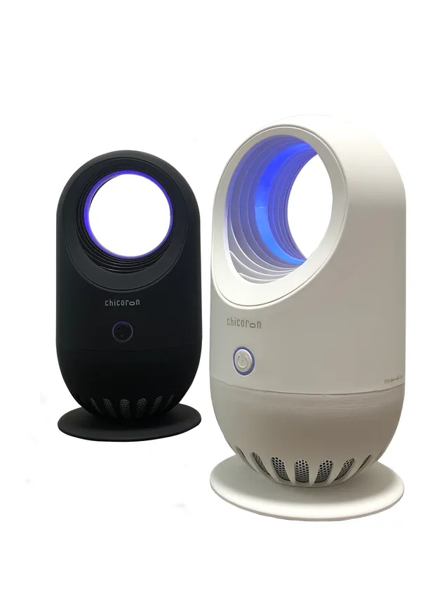 チコロンは、本体中央部にある紫外線を発生させるLED誘虫灯で蚊をおびき寄せ、強力なファンで吸い込み、蚊を捕獲します。薬剤や煙を使わず蚊を捕獲する事ができるので人体や環境にやさしい機能です。