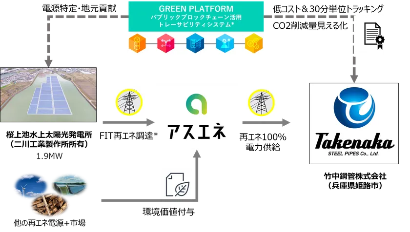 具体的には、当社が所有する兵庫県内1箇所のフロート式水上太陽光発電所(桜上池水上太陽光発電所 1,991KW)から生み出した電気を、小売電気事業者であるアスエネ株式会社(東京都品川区、代表取締役CEO:西和田 浩平)を通じて、ブロックチェーン活用のトラッキングシステムでマッチングさせ、竹中鋼管株式会社の自社オフィスや工場に電気を提供いたします。