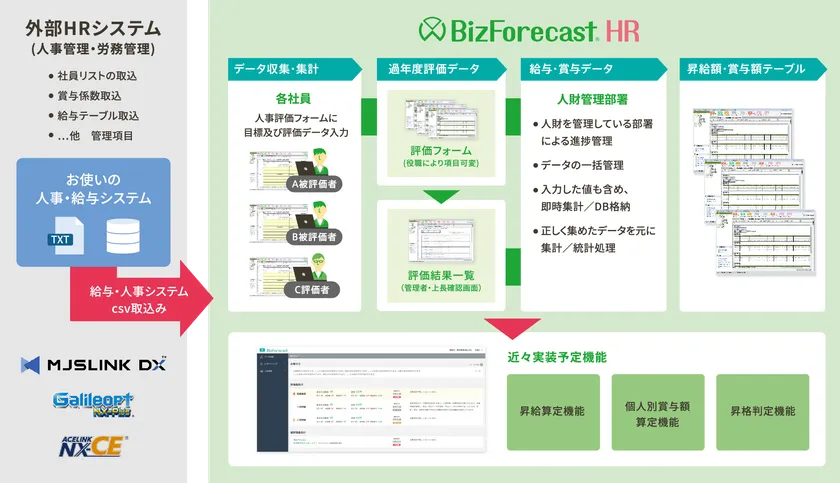 「BizForecast HR」は、お使いのExcel資産を取込み、人・組織の人事評価・目標管理の制度設計項目を反映する事で、集計・配信業務をクラウド上で管理します。BizForecast BC(予算実績管理)へ連携すれば、人事評価と経営管理へ繋げる人件費シミュレーションで高度なグループ経営管理を実現できます。さらに、会計ERP、人事・給与とも連携し、業務効率化を推進します。