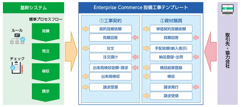 今回提供を開始するEnterprise Commerce 設備工事テンプレートは、標準機能では対応が難しかった、建設業・設備工事業で必要となる「工事契約」や「資材購買」に対応します。一例として、「出来高検収依頼・請求」「手配依頼(納入指示)」などの機能を実装し、建設業・設備工事業の購買業務全般をカバーします。