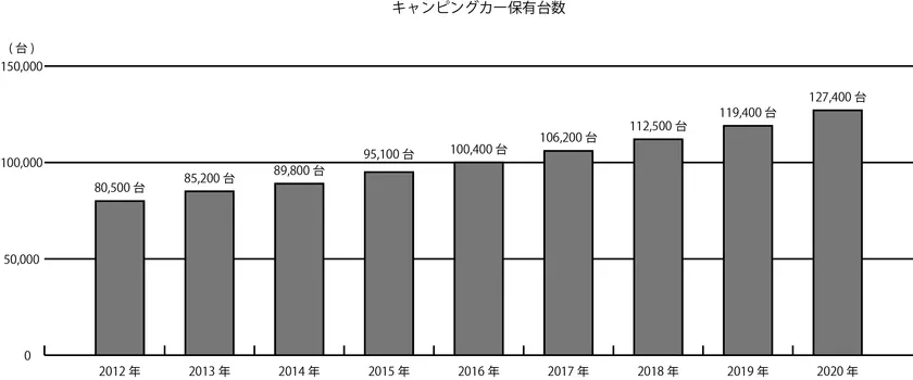 国内のキャンピングカー保有台数は増え続けており、2016年に10万台を超えてから、順調にその数値を伸ばしている。