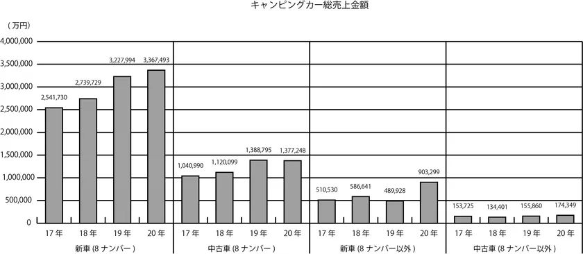 2017年から424億円、458億円、526億円、582億円と増加しながら推移してきている。車種ごとの販売金額を見てみると、キャンピングカー登録となる8ナンバーの新車が336億円、中古車が137億円、8ナンバー以外の新車が90億円、中古車が17億円であった。