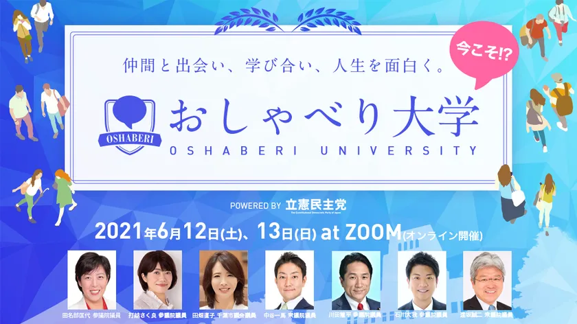 立憲民主党青年局は2021年度より、学生・若者がコロナ禍を乗りこえ仲間と出会い、学び合える新しいコミュニティ『おしゃべり大学』をスタートしました。日本全国の“学びたい”若者がオンラインを中心に出会い、豊富な経験・専門性を持ったゲストや政治家たちとともに様々な社会テーマや政策を学び合うことで、一人ひとりの人生がより面白く豊かになることを目指す、オンラインの仮想大学的なコミュニティを目指していきます。
