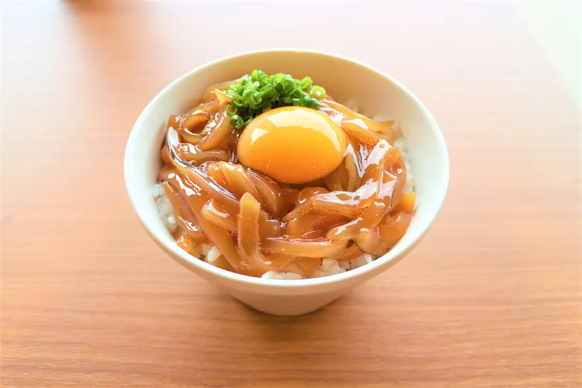 「船凍イカの醤油漬け丼」は、石川県輪島市にて醤油・味噌の製造、販売を手掛ける株式会社谷川醸造の「サクラ醤油」をベースに、能登町越坂にてイカの魚醤「いしる」の製造・販売を手掛けるヤマサ商事株式会社の「いしる」を使いました。甘めの醤油を使いながらも「いしる」のコクが加わり、イカとの相性の良い仕上がりとなりました。