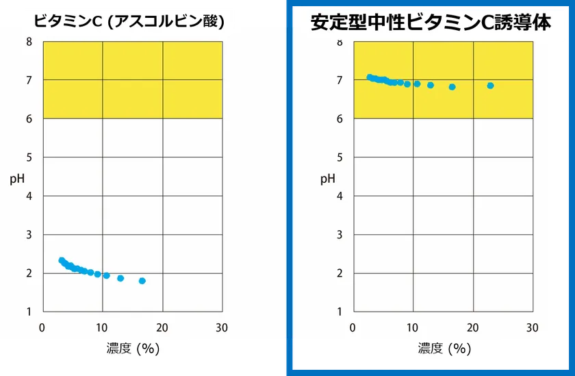 「安定型中性ビタミンC誘導体」は、水溶液の濃度を上げても、pHは中性域内です。