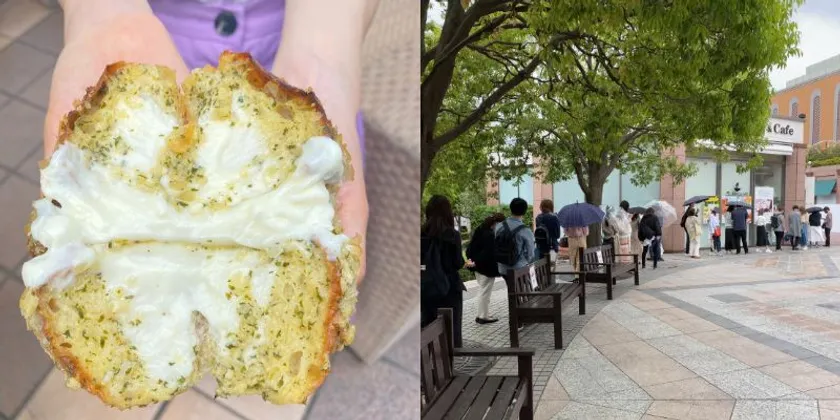 「俺の罪悪パン」断面と毎日の行列の様子