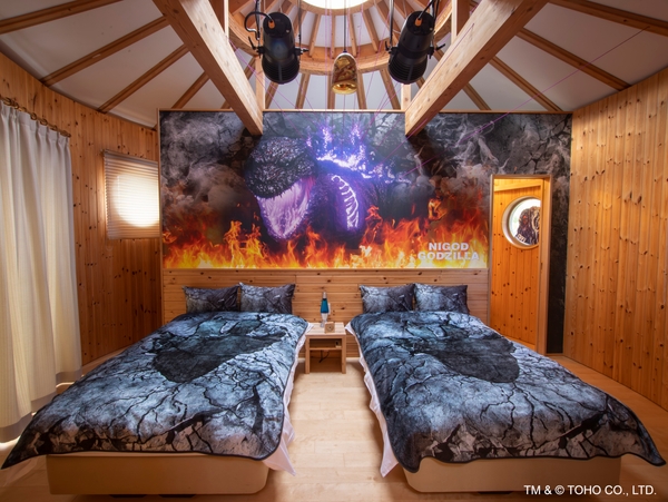 室内には、歴代ゴジラと人気怪獣たちが描かれたインテリアやタペストリー、窓越しに見える実寸大ゴジラの一部、さらに、それらに光の照射で見え方が変わる特殊加工を施すことによって、昼・夜で異なった室内の雰囲気をお楽しみいただけます。室内に隠れた全ての怪獣たちを見つけ出すことで豪華特典が手に入る“特別任務”に挑戦していただくなど、昼夜通してお愉しみいただけるお部屋です。