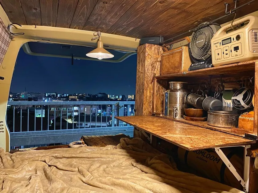 車中泊での折りたたみテーブル(Instagram maohenry様)