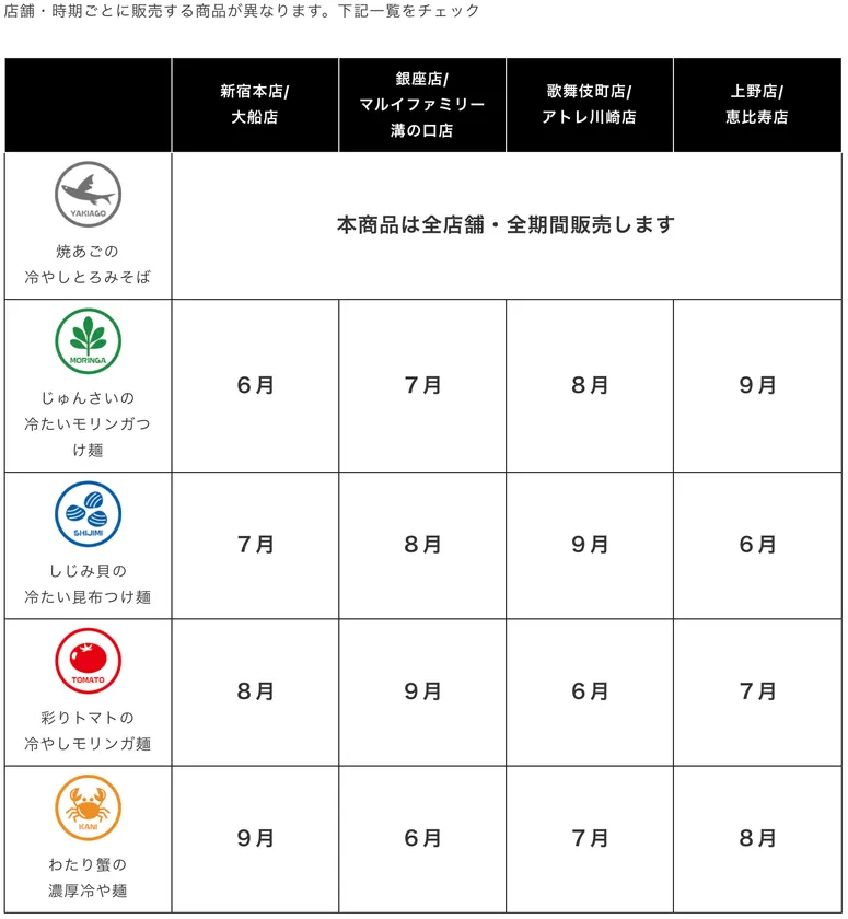 今年は、「らぁ麺やまぐち」山口 裕史氏監修プロデュースの「焼きあごの冷しとろみそば」(全店舗通期販売)のほか、お客様の心身ともに元気に豊かにしたいという想いを込めて、高級食材の焼きあご、夏野菜、スーパーフード「モリンガ」を使用した麺の「じゅんさいの冷たいモリンガつけ麺」など自慢の冷し麺全5種類が完成しました。
