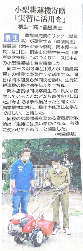 中古農機具の買取販売専門店「農機具王」を全国で20店舗展開している株式会社リンク(本社:滋賀県近江八幡市、代表取締役:濱田義郎)は、2021年5月11日(火)、学校法人 桐丘学園桐生第一高等学校(所在地:群馬県桐生市、校長:味戸 克之、以下 桐生第一高校)の「ものつくりコース」に中古の小型耕運機1台を寄贈しました。