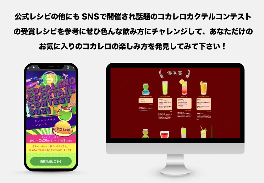 SNSで開催されたコカレロカクテルコンテストでも沢山の素敵なカクテルが投稿されました。レシピの参考に是非ご覧ください。URL: https://cocalero.jp/cocktail_contest/