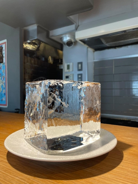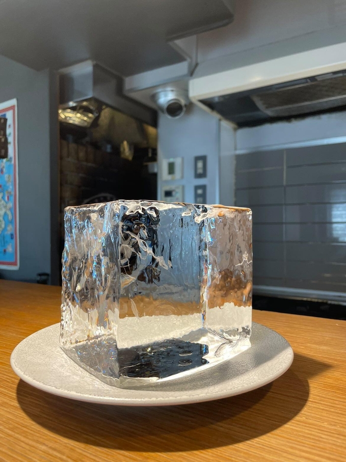 ■氷にこだわる。「八ヶ岳の天然氷」を薄く長く削る匠の技使用する氷は、山梨・八ヶ岳の天然氷「蔵元八義」。氷そのものの透明感とやわらかな口どけを最大限に引き出すため、薄く・長く削る独自の手法を採用。冷たさを感じにくく、口の中でふわっととろける新食感をお楽しみいただけます。かき氷機の「刃」も妥協なし。専門の職人とともに、最適なサイズ・削れ具合を追求し、1杯1杯丁寧に仕上げています。