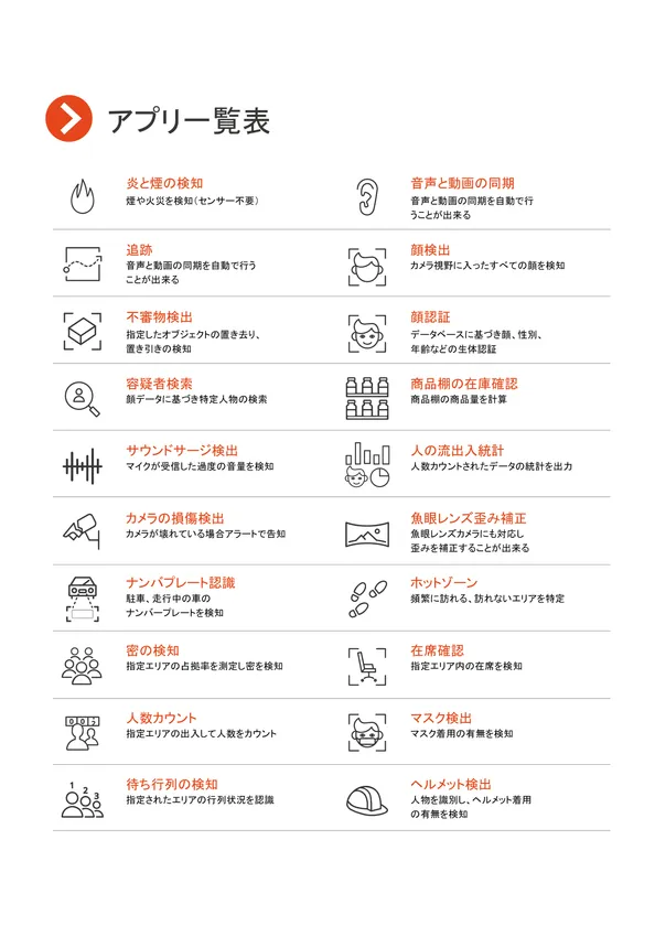 既存の監視カメラを活用して、重要なデータをリアルタイムに可視化・データ化・解析できるアプリケーションです。記録・収集したデータは、リアルタイムはもちろん、後からレポーティングしたり、共有したり、数値化したりする事が可能で、データ収集後の有効活用も可能です。