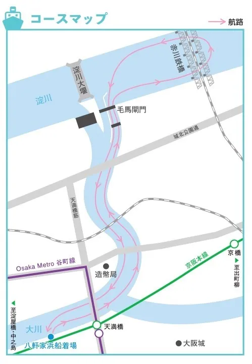 ◆八軒家浜船着場を発着地とし、毛馬閘門の通過や淀川を遊覧するコースです。