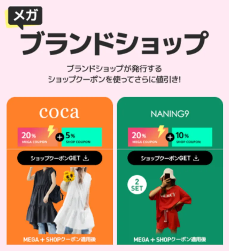 今回はメガ割に初登場のショップも多く、トレンドファッションをリーズナブルに手に入れられる「Honeys(ハニーズ)」や、韓国の大人かっこいいクールなブランド「BLACKUP(ブラックアップ)」など、この夏注目アイテムを手に入れる絶好のチャンスです。さらにお得にショッピングを楽しめる特別コーナーとして、深夜0時に更新される衝撃特価「メガ タイムセール」や、ブランドショップが発行するショップクーポンでさらに割引になる「メガ ブランドショップ」を設置します。また、売れ筋商品がリアルタイムにチェックできる「メガ割ランキング」や、セール中に検索されているホットなキーワードを一目で見つけられる「メガ割 人気キーワードランキング」コーナーなど、今トレンドの商品を簡単に探せる仕組みも用意しています。