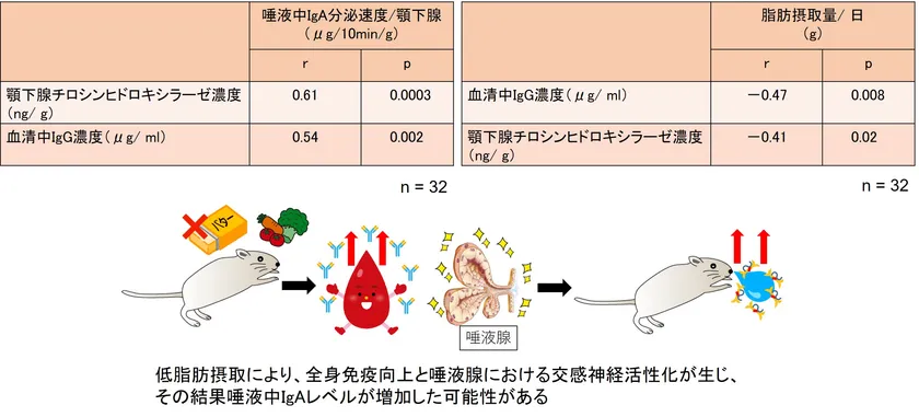 本研究では、ラットを用いた動物実験により、脂肪摂取量の違いとフラクトオリゴ糖摂取の有無が唾液中IgA分泌速度に与える影響を検討しました。ヒト栄養指導への応用を想定して、高脂肪飼料は脂肪含有量をカロリー比40%(現在のヒトにおける高脂肪摂取上限)、低脂肪飼料は脂肪含有量をカロリー比14%(1965年の脂肪摂取量)に設定しました。ラットを「低脂肪・無繊維飼料摂取」、「低脂肪・フラクトオリゴ糖添加飼料摂取」、「高脂肪・無繊維飼料摂取」、「高脂肪・フラクトオリゴ糖添加飼料摂取」の4群に分け、肥満の影響を排除するため各群の摂取熱量を等しくなるように調整して飼料を摂取させました。10週後、低脂肪・フラクトオリゴ糖添加飼料摂取群の唾液中IgA分泌速度、顎下腺チロシンヒドロキシラーゼ濃度(交感神経活性化のマーカー)、血清中IgG濃度(全身免疫状態の指標)が高値となりました(図:1)。唾液中IgA分泌速度と顎下腺チロシンヒドロキシラーゼ濃度および血清中IgG濃度には正の相関が認められました(図:2)。また脂肪摂取量と血清中IgG濃度および顎下腺チロシンヒドロキシラーゼ濃度には負の相関が認められました(図:2)。