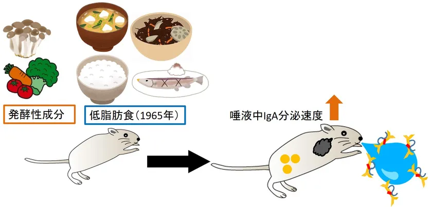 IgAは粘膜免疫の主役であり、呼吸器・消化管の粘膜表面で感染防御機能を担っています。「呼吸器と消化管の入り口」として重要な役割を果たす口腔の唾液中には多種の抗菌物質が含まれていますが、中でもIgAが最も主要な抗菌物質で、唾液中IgAが上気道感染症の感染防止に大きく関与していることは数多く報告されています。超高齢社会の日本では上気道感染症から引き起こされる高齢者の肺炎の増加が社会問題となっており、早急な予防対策が求められています。唾液中IgAレベルを食事要因で上昇させることができれば、易感染性である高齢者や基礎疾患を有する者の肺炎予防に簡便で効果的と考えられますが、食事内容が唾液中IgAレベルに与える効果は未だ十分に判明していません。特に免疫機能を低下させることが報告されている高脂肪食摂取が唾液中IgAレベルに与える影響は明らかにされていません。