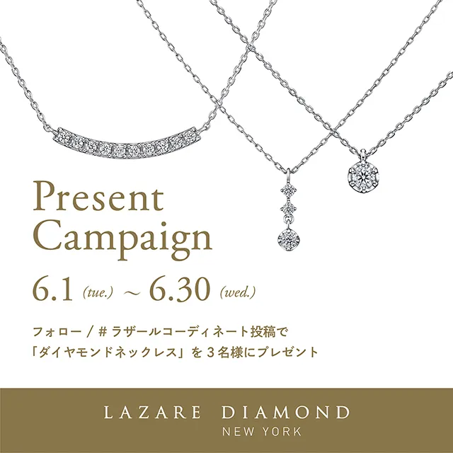 ブライダルジュエリーの企画・販売を行うプリモ・ジャパン株式会社(本社:東京都中央区、代表取締役社長:澤野 直樹)が運営するダイヤモンド専門店「ラザール ダイヤモンド ブティック」は、『ラザール コーディネート キャンペーン』を2021年6月1日(火)より実施いたします。「6月に結婚する花嫁は幸せになれる」そんな、ロマンティックなジューンブライドの季節を祝ったキャンペーンは、ラザール ダイヤモンド ブティック公式インスタグラムで、結婚式で人気のエンゲージカバーセレモニーにもおすすめな、コーディネート画像を投稿。抽選で3名の方に普段使いにも最適な「ダイヤモンドネックレス」をプレゼントいたします。この機会に是非ご応募ください。