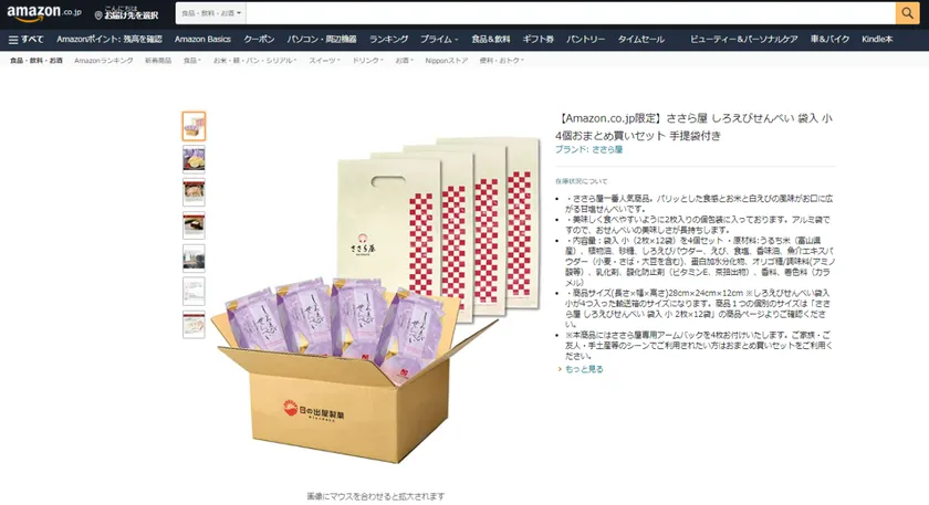 創業97年の老舗米菓メーカー日の出屋製菓産業株式会社(本社:富山県南砺市、代表取締役社長:川合 声一)は6月4日にインターネット総合モールAmazon.co.jpで「【Amazon.co.jp限定】ささら屋 しろえびせんべい 袋入 小 4個おまとめ買いセット」の販売を開始します。当社の人気商品であるしろえびせんべいの自家用タイプの袋入が4個セットになった「まとめ買い商品」をAmazon Prime商品として販売します。全国翌日配送(一部、離島などを除く)の対応を行い、コロナ禍で店舗や観光地に行きづらい顧客に対して在宅ワークのハイエンドおやつやプチギフトとしてしろえびせんべいの購入しやすい環境を整えていきます。