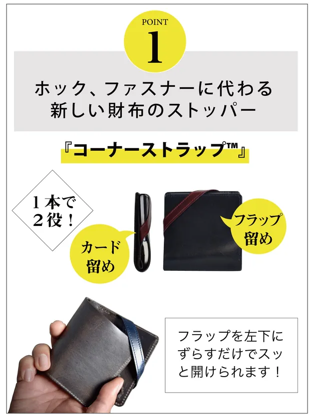 「薄く・小さく」は当たり前で「使いやすくて大容量」というニーズに対し、革の二つ折財布【理 kotowari(R) mini】は、ミニ財布としての大容量を確保して、「薄く・小さく・使いやすい」を実現しました。この作品で多くいただいたご意見が、特許要素の一つ「コーナーストラップ(TM)」を交換可能にしてほしいということでした。