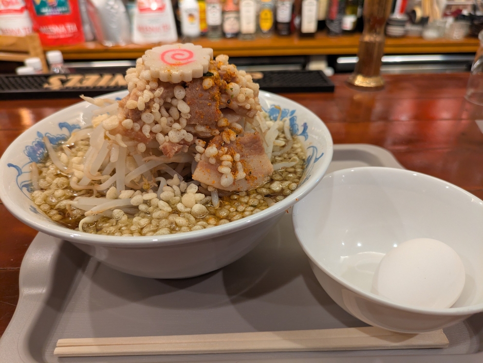 麺300g、肉100g、もやし200gという満足感のある構成に、生卵が付いた一杯です。