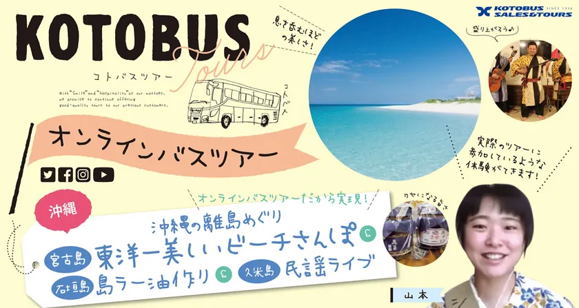 このたび、さまざまな企業・自治体と共同でオンラインバスツアーを数多く実施している琴平バス株式会社(本社:香川県琴平町、代表取締役:楠木 泰二朗)と沖縄では初となるタイアップイベントを開催。自宅にいながらPCやスマホで石垣島・宮古島・久米島の3離島の魅力を感じることができるツアーとなっています。