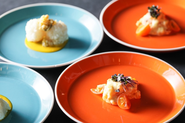 ブラックタイガーのフリット オレンジマヨとレッドオニオン(グロールタイガー)/白身魚のフリットとグリビッシュソース ターメリックの香り(シラバブ)/コラーゲン入りずわい蟹とアオサのビューティースープ(ゴミ捨て場に浮かぶ月)/ホワイトアスパガスとベーコンのガルビュール(アスパラガス)/アンチョビと黄蕪のスパゲッティ アーリオ・オーリオ(カーバケッティ)