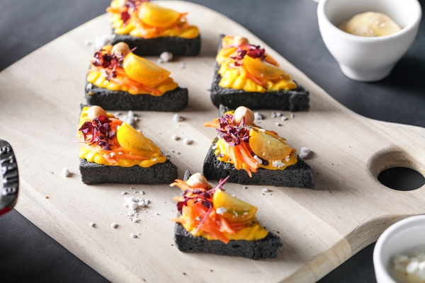 スモークサーモンと黄人参のサラダ マスカルポーネと黒オリーブのパウダー(スキンブルシャンクス)