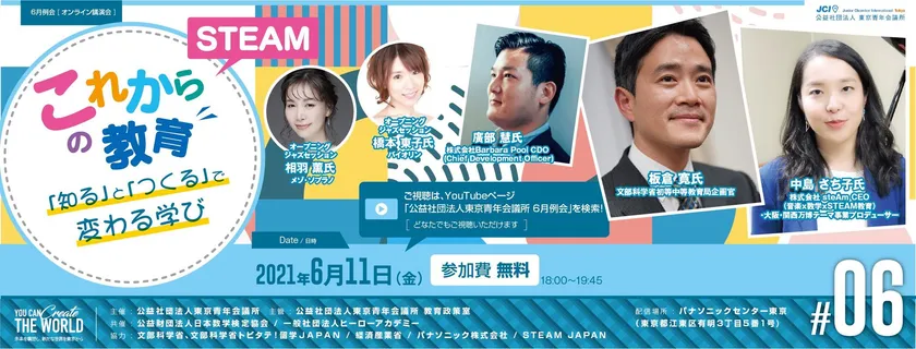 本講演会は、東京青年会議所が社会貢献活動の一環として、教育・経済・国際分野などの有識者を交えて、月に1度開催しているもので、今回はSTEAM教育をテーマに、基調講演やパネルディスカッションなどを行います。講演者には、文部科学省 初等中等教育局 企画官の板倉寛氏、数学研究者・ジャズピアニストでSTEAM教育の普及にも取り組んでいる中島さち子氏らをお迎えします。
