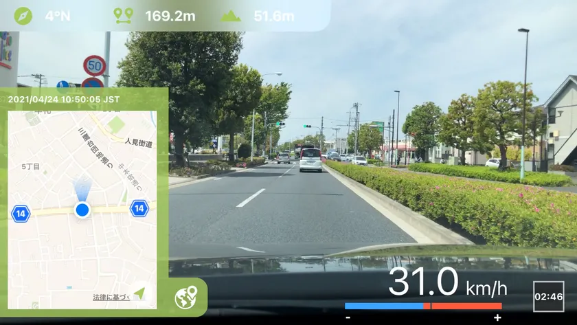 地図、カメラの向き(方位)、移動距離、標高、現在時間が直感的にわかる