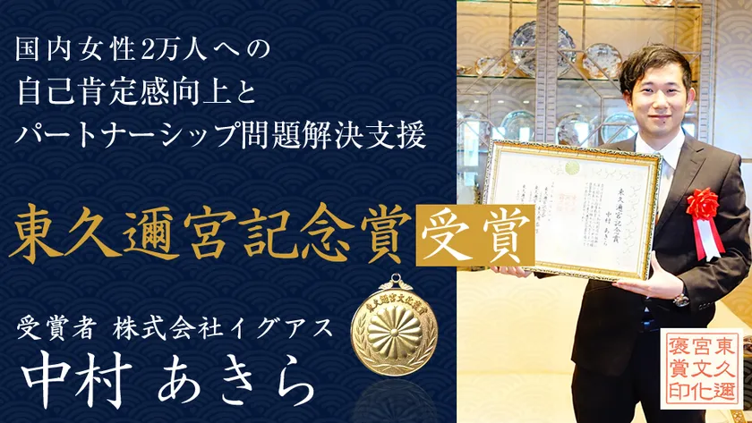 女性向けのパートナーシップカウンセリング&トレーニングサービスを展開する、長崎発スタートアップの株式会社イグアス 代表取締役CEO 中村 あきらが、知的創造の振興に深く関わった人物に贈られる「令和三年 東久邇宮記念賞」を受賞したことを、お知らせいたします。