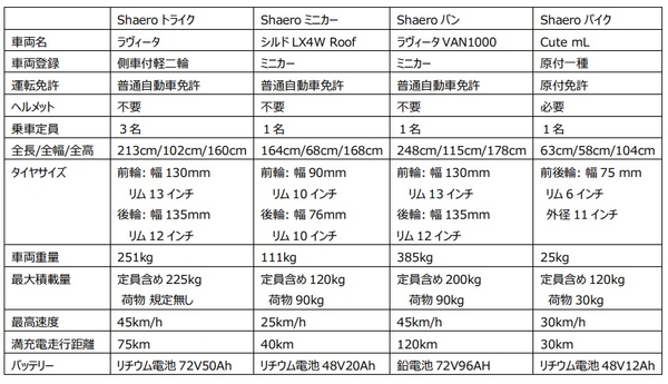 Shaeroは、3月中には「Shaeroトライク」、「Shaeroミニカー」および「Shaeroバン」の運用テストを終えて、一部のステーションにて一般ユーザーもこれらの車両の利用が可能となるように準備をしております。今後は、リゾートエリアや観光地など家族での移動が見込まれるエリアでは「Shaeroトライク」の、また温泉地などあらゆる世代の方が訪れるような観光地では「Shaeroミニカー」のステーションを設置する予定です。また、「Shaeroバン」については、一般利用者の荷物輸送ニーズがあるエリアや大型店舗へのステーション設置や、法人専用機能とセットで物流拠点への提供を検討しております。