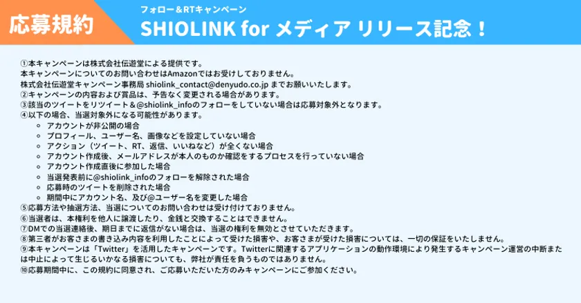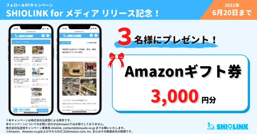 SHIOLINK for WEBメディアではリリースを記念して、当社Twitterアカウントをフォロー&RTした方の中から抽選で3名にAmazonギフト券3,000円分のプレゼントを行うキャンペーンを実施いたします。