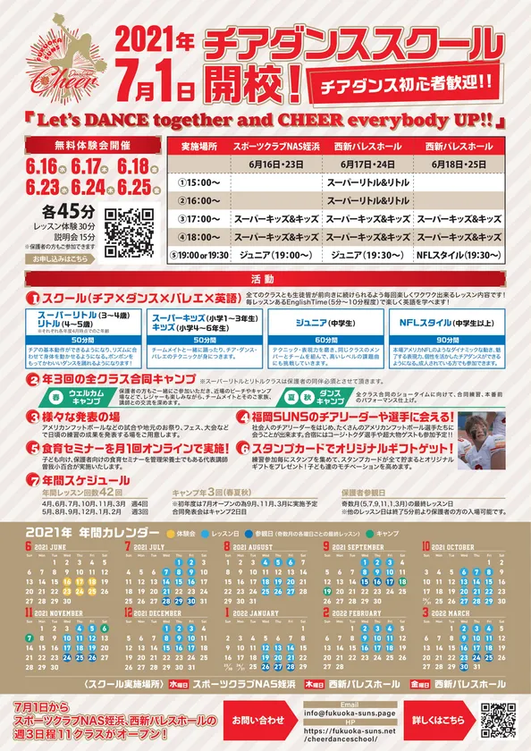一般社団法人福岡SUNSは、2021年7月1日に福岡市内にて「福岡SUNSチアダンススクール」を開校致します。元NFLチアリーダーで管理栄養士の資格を持つ「曽我小百合」氏がスクール代表を務める、「チア×ダンス×バレエ×英語×食育」をコンセプトにした日本初の複合的チアダンススクールとなります。週3日、2か所11スクールを7月1日よりスタートさせます。場所は、スポーツクラブNAS姪浜店、西新パレスホール(2022年4月より別会場に移動予定)。対象は3歳~成人まで。中学生までのクラスと別に、中学生から成人までを対象とした元NFLチアリーダーならではの「NFLスタイル」クラスも1クラス開校します。6月16、17、18、23、24、25日の6日程、各会場にて無料体験会を実施し、生徒を募ります。無料体験会のお申し込みはこちら( https://forms.gle/7oi769ZmdMARrGup8 )から。