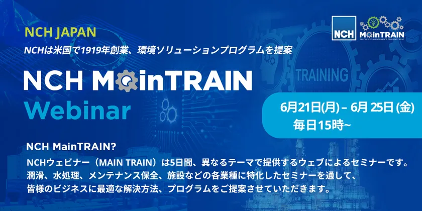 工業・商業施設向けのメンテナンス製品およびサービスを提供する日本エヌ・シー・エイチ株式会社(所在地:東京都千代田区、代表取締役:ウォルター・エム・レヴィ、以下「NCH」)は、4つの専門性プログラムが異なるテーマで、潤滑、水処理、メンテナンス保全、施設などの各業種に特化したセミナー「MainTRAIN Webinar」を、2021年6月21日(月)~6月25日(金)の期間、毎日15:00から開催いたします。本セミナーでは、製造業や自動車業界、建機、農機具関係、ホテル、病院などのサービス業界、各業界向けのメンテナンスとして最適な解決方法、プログラムをご提案いたします。