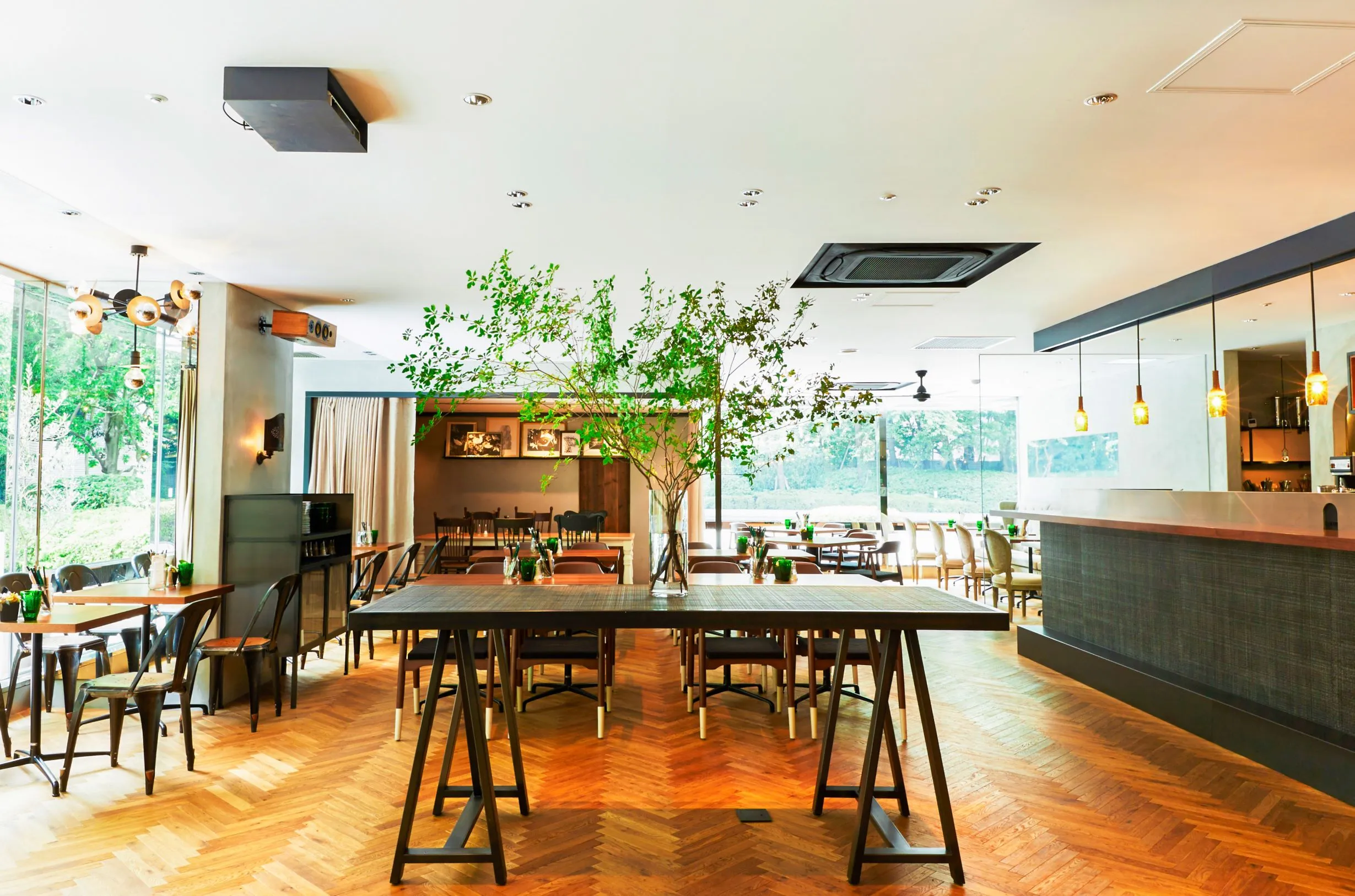 全面ガラス張りの開放感ある店内の窓からは、緑豊かで都会の喧騒を忘れる都心のオアシス。安心してご利用いただく為に、オープンスペースの店内ゆえに換気は十分に行われ、お客様同士の距離も保っています。また入店時のアルコール消毒の徹底、従業員のマスク着用や体温管理の徹底や店内清掃等、新型コロナウイルス蔓延防止対策を徹底しています。