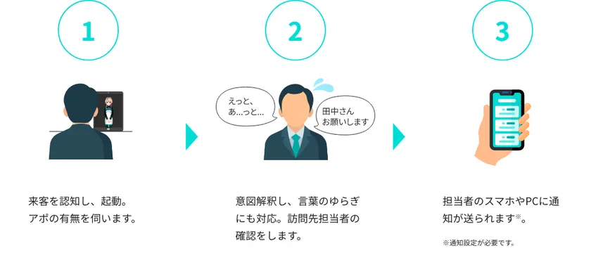 これにより、機械的な対応ではなく、より人とのコミュニケーションに近い感覚で来客の取次を可能にします。