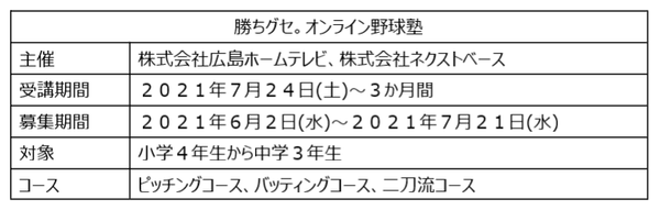広島ホームテレビ(所在地:広島県広島市 代表取締役社長:三吉 吉三)とスポーツ科学とITを融合したデータプラットフォーム事業を推進する株式会社ネクストベース(所在地:東京都品川区 代表取締役:中尾信一)は、この度、最先端のスポーツ科学の学術研究を用いた「勝ちグセ。オンライン野球塾」の実証実験を開始いたします。