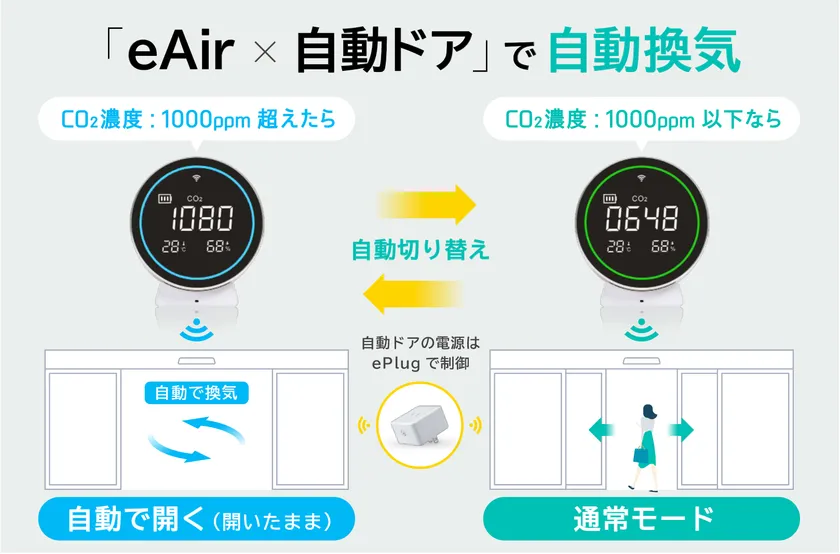 CO2センサーeAir(イーエアー)が、室内のCO2濃度が1,000ppmに上昇した事を検知するとスマートプラグePlug(イープラグ)が稼働し、自動ドアの制御装置に信号を入力させてドアを開き、換気後、CO2濃度が900ppmに下降した事を検知すると自動ドアの信号を止めて、通常のドアとして作動させます。電源制御していないため、安全に自動ドアを使用できます。(※開閉を開始するCO2濃度の数値は自由に設定可能。)