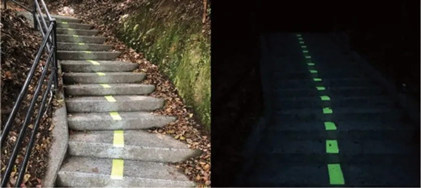 電力供給が不十分な場所、停電が発生した場合でも高い視認性で安全に避難誘導することができます。また、用水路と道路の境に塗装すれば転落事故の防止にも寄与します。塗料なので複雑な構造物や凸凹のある被塗物など、テープやプレートでは対応の難しいところを光らせることができます。