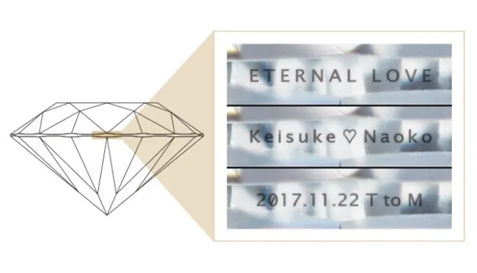 リングの内側への刻印よりも珍しいダイヤモンドの刻印。ふたりだけの秘密として情熱的な言葉を刻むのもお勧めです。