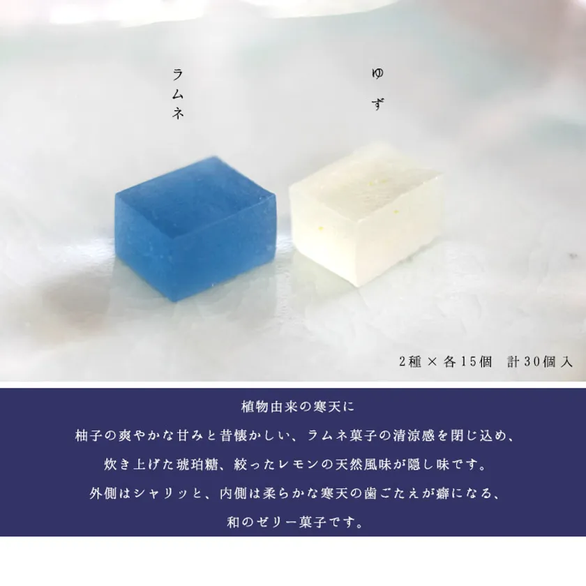 植物由来の寒天に、柚子の爽やかな甘みと昔懐かしいラムネ菓子の清涼感を閉じ込めました。外側はシャリッと、内側は柔らかな寒天の歯ごたえが癖になる、和のゼリー菓子。絞ったレモンの天然風味が隠し味。懐かしい想いを馳せながら、ひとくちで幸せな気分に。お茶会などに彩りを添えて、気軽につまんで頂ける御菓子。京都らしさを感じる化粧箱に入れてお届けいたします。