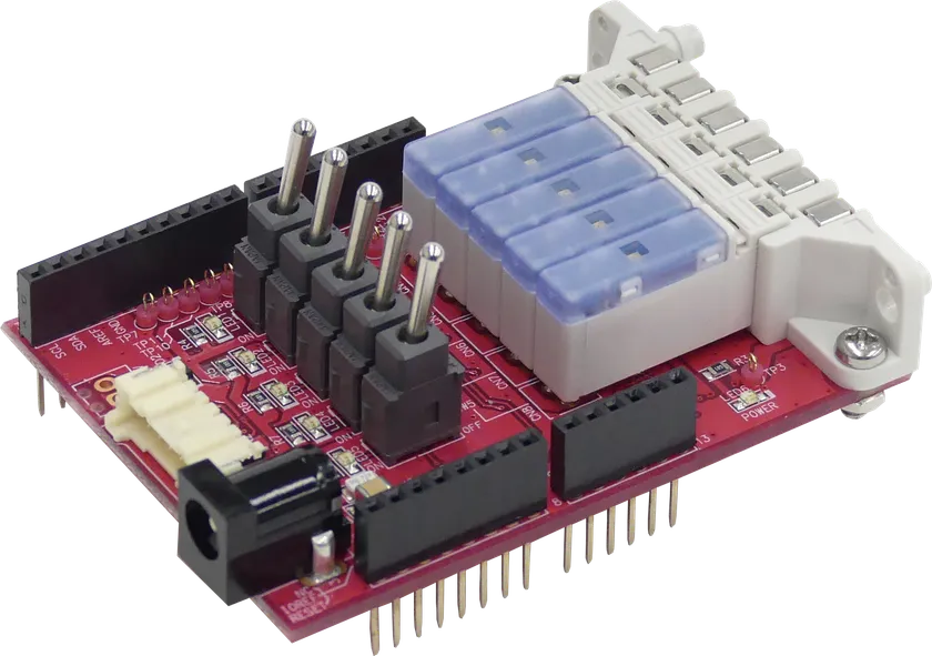 PMCシリーズは、Arduino uno R3に対応したシールド基板で、基板に小形の空気圧バルブを5台搭載しています。電源は家庭用コンセントから供給できて、空気圧の配管は搭載するバルブに空気圧源と動作させたいロボットを接続するだけです。当社の特設ホームページからダウンロードしたソースコードをArduino uno R3に書き込み、パラメータを設定するだけでロボットを制御することができます。もちろん、お客様ご自身で作成したソースコードを書き込んで使用することもできます。研究開発のクイックスタートには、うってつけの製品であり、小形・軽量であることから、装置などへの組込みにも適しています。