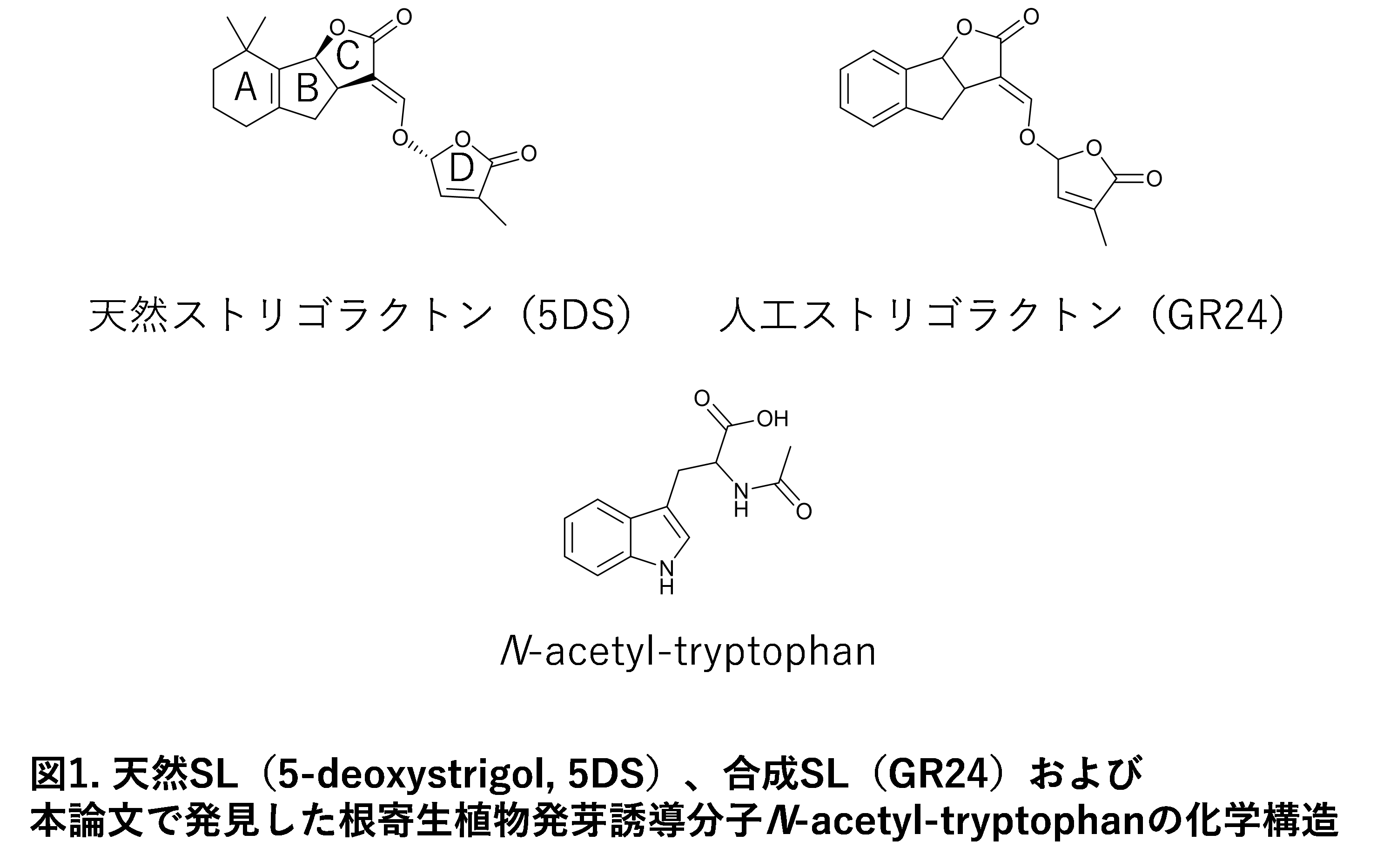 枝分かれを制御する植物ホルモン ※1であるストリゴラクトン(SL、図1)は、栄養条件に応じて植物の枝分かれを適切に制御する重要な役割をもっています。それだけではなく、SLは根から放出され、植物にリンなどの無機栄養を供給してくれる共生菌であるアーバスキュラー菌根菌 ※2を活性化し、共生を促す作用も有しています。その一方で、アフリカなどで大きな被害をもたらしているストライガ ※3などの根寄生雑草は、このストリゴラクトンを感知して発芽し、作物などの根に食いついて、水や養分を奪って枯らしてしまうことが知られています。この被害は全世界で年間1兆円を超えると言われており、甚大な農業被害となっています。日本国内でこれまで大きな被害は報告されていませんが、外来種であるヤセウツボが様々な地域に生息していることが知られています。現在、根寄生植物の効果的な防除法として、自殺発芽誘導法が考案されています。この方法では、根寄生雑草の発芽を誘導するSL或いは同等の活性を有する分子を、作物を植え付ける前の圃場に散布し、根寄生植物を強制的に発芽させて枯死させる方法です。この方法の有効性は示されてきていますが、SL等の分子は、合成する際のコストの問題もあり、これまで実用化には至っていません。そこで本研究では、SL様物質を生産する微生物を大量培養し、醗酵法により自殺発芽誘導剤を生産することを目的に、そのような微生物の探索を目的にスタートしました。微生物のスクリーニングに先立ち、研究グループは、微生物の培養に用いる培地成分に根寄生植物の発芽に影響を与える分子が含まれている可能性を考え、微生物の培地成分の作用を調べました。